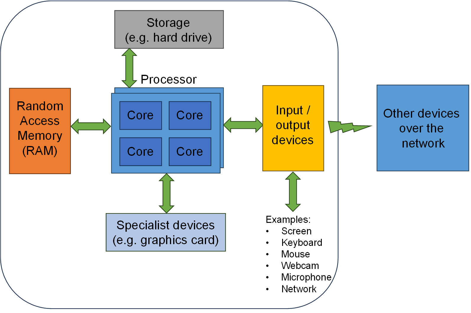 There are a range of Input/Output (I/O) devices such as the screen and keyboard for interacting with the computer. These include a network port (wired or wireless) to connect to other devices.