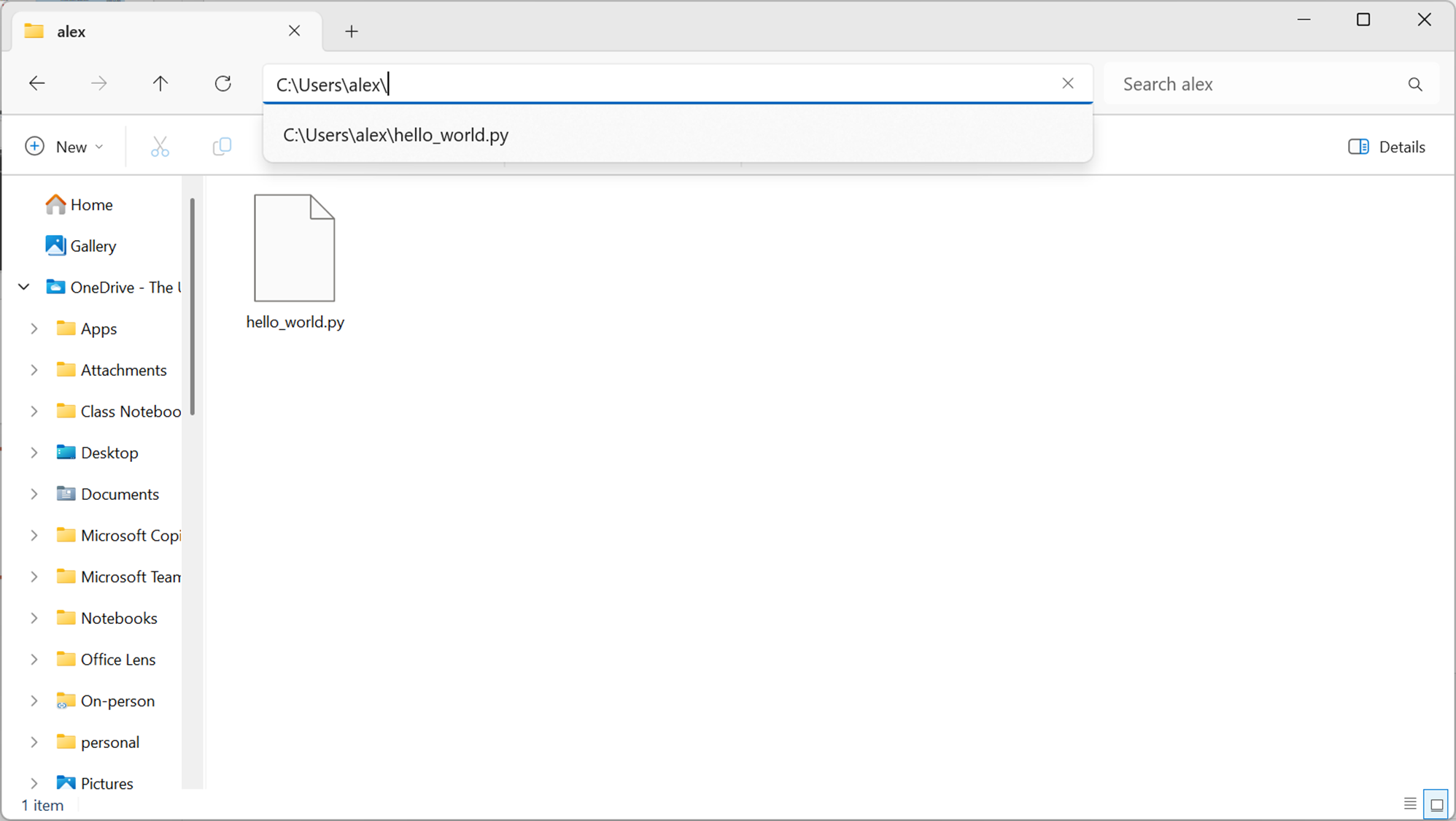 We can also see this location (C:\Users\alex\) if we use the File Explorer GUI. It contains a file called hello_world.py.