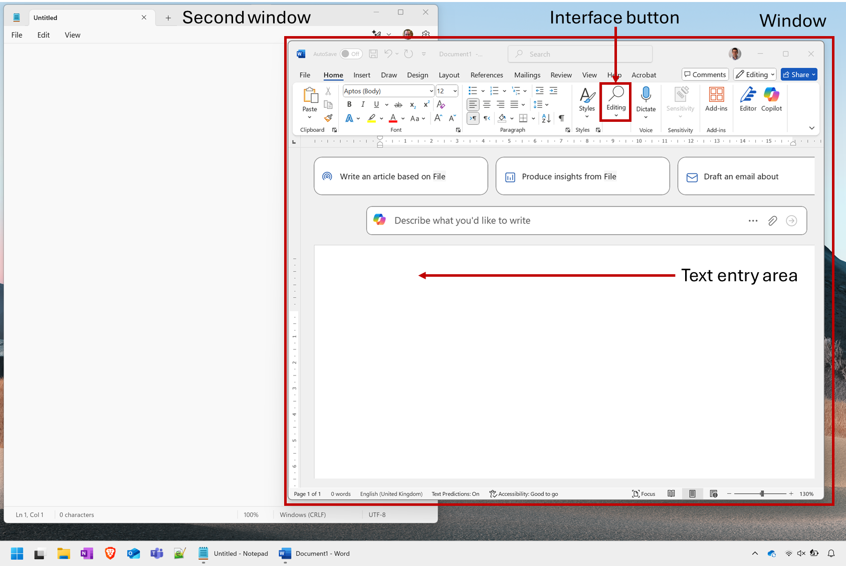 Different Apps and Programs are displayed in windows, which you can arrange to view multiple different things at the same time. Within each window, the App has buttons to control what it does, possibly areas to enter text, and so on. You interface with these via the keyboard, mouse, and possibly touch (if you have a touchscreen computer).