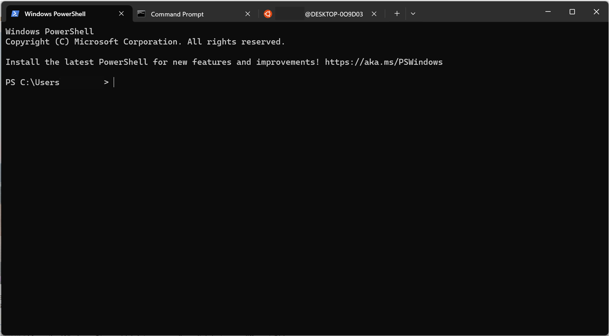 You can start these CLIs from the Start menu (or similar) as you would any other program. An example of Windows Terminal, giving access to the Command Prompt, PowerShell and a Linux terminal, is shown below.