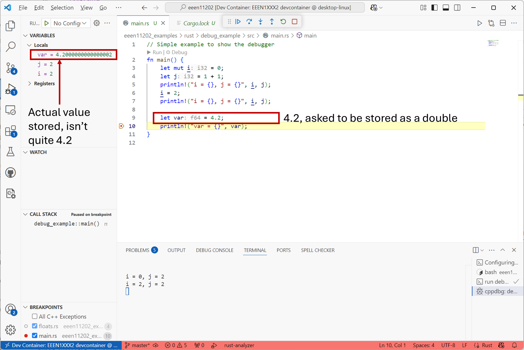What we find, very quickly, is that not every possible number can be represented exactly as a floating point number. The example below shows an easy number, 4.2, being stored in a variable, and this variable being viewed in the debugger. What is actually stored is 4.2000000000000002. (This example is using Rust, where f64 sets the data type to be a double.)