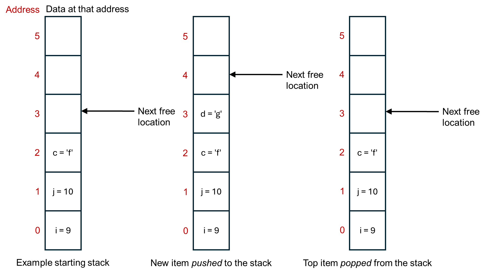 Memory in the stack is contiguous. That means that all of the memory locations are next to each other, in a stack. It in fact operates as first in, first out buffer. The stack pointer stores where the next free memory location is. Each time a new variable (or similar) is made, it’s put on the top of the stack. The computer thus doesn’t have to search for a suitable memory location, it just puts the next item on top of the big pile of items that it already has. Variables on the stack are automatically deleted when they go out of scope, say when a function exits. This is illustrated below.