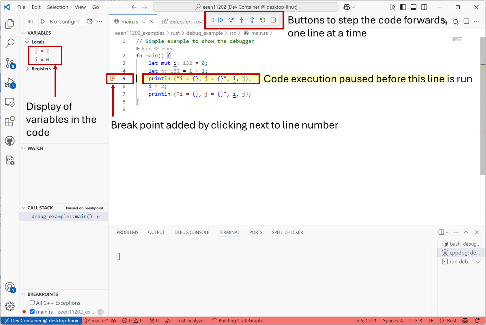 The debugger is for analyzing your code, while it is running. It puts the code into a special state which lets you look at (say) the value of a variable. This makes the code slower to execute, as everything needs to be logged, but is very useful for examining what’s going on when things aren’t working as expected. Most debuggers then let you then step through the code, say line-by-line, to let you pin-point errors and, hopefully, fix them. An example in Rust is shown below.