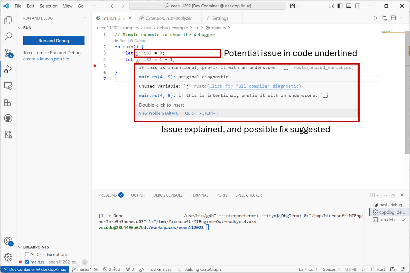 Linting is essentially a spell-check of your code. The example below shows Rust program code. It has detected that the variable j (and indeed i in this simple example) is never used. It’s checking that this is what you want, because it might indicate a mistake. Moreover, it suggests using the preferred (but optional) style of using _j to indicate it’s deliberately not used for some reason. Indeed for a simple error like this offers a Quick Fix to automatically correct it for you.
