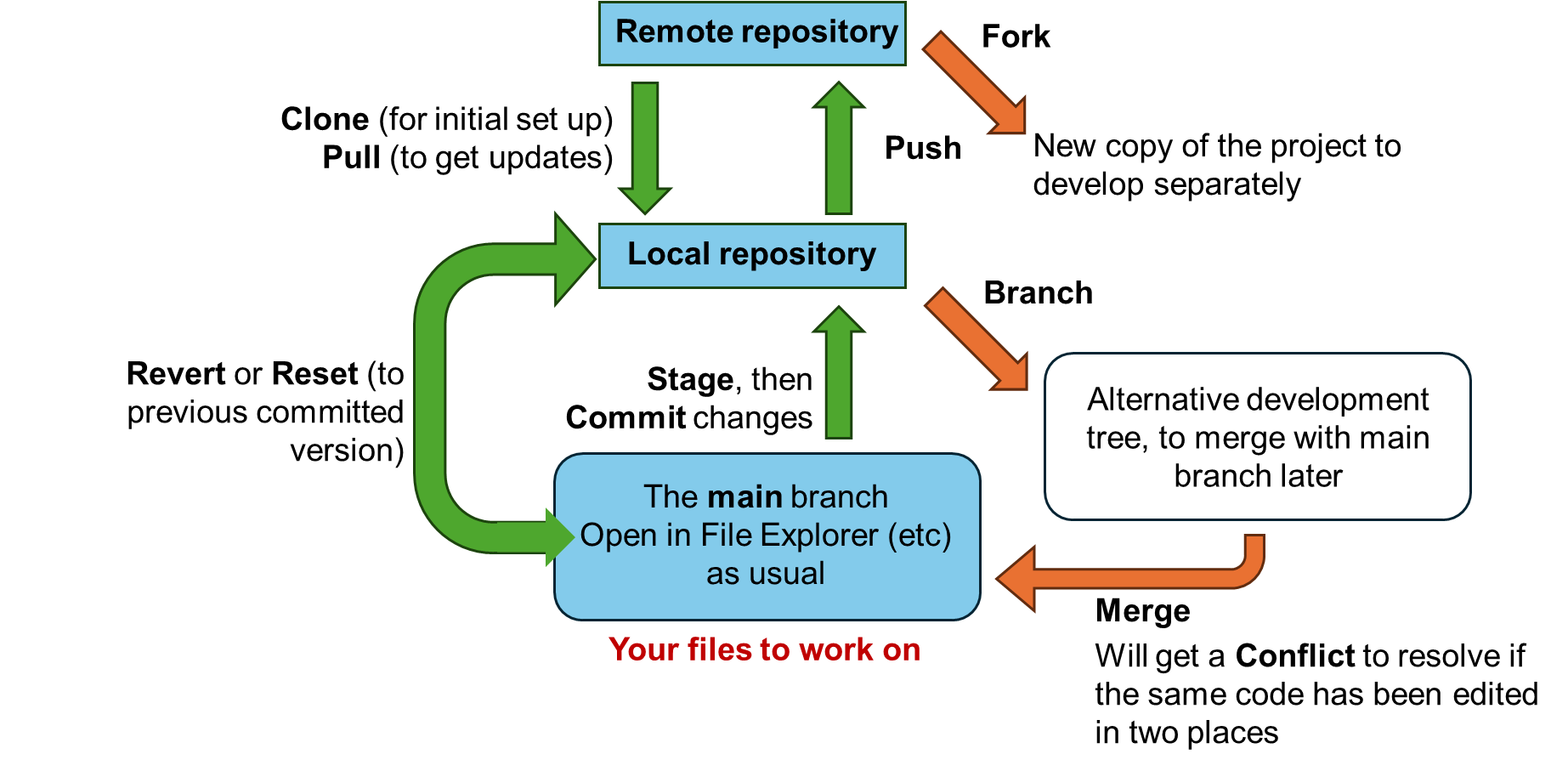 We’ll see git in the labs. To briefly introduce it, the usage model is shown below. The core flow is shown in green. More optional, and more advanced, functions are shown in orange. The terminology used is: