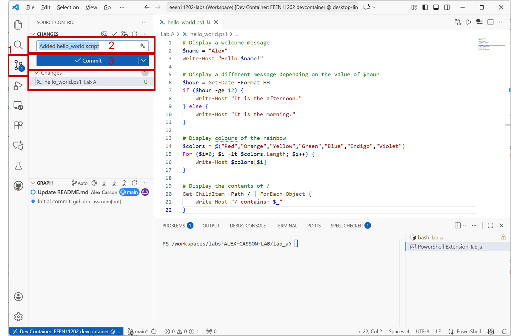 In the first part of this lab you made a new file, called either hello_world.ps1 or hello_world.sh. Let’s add this to the version control system so that we have a record of it, and can track any changes we make to it in future.