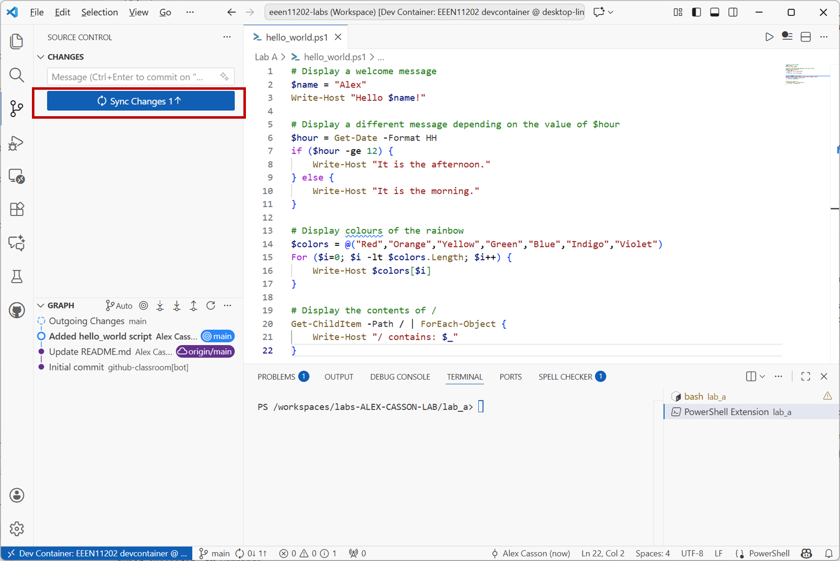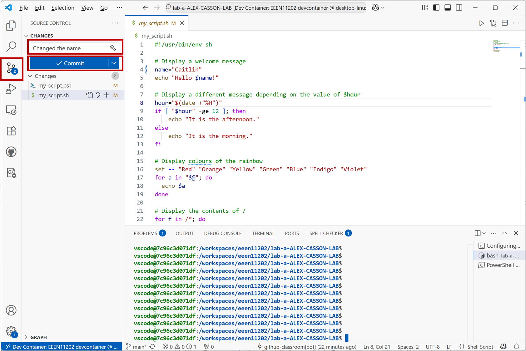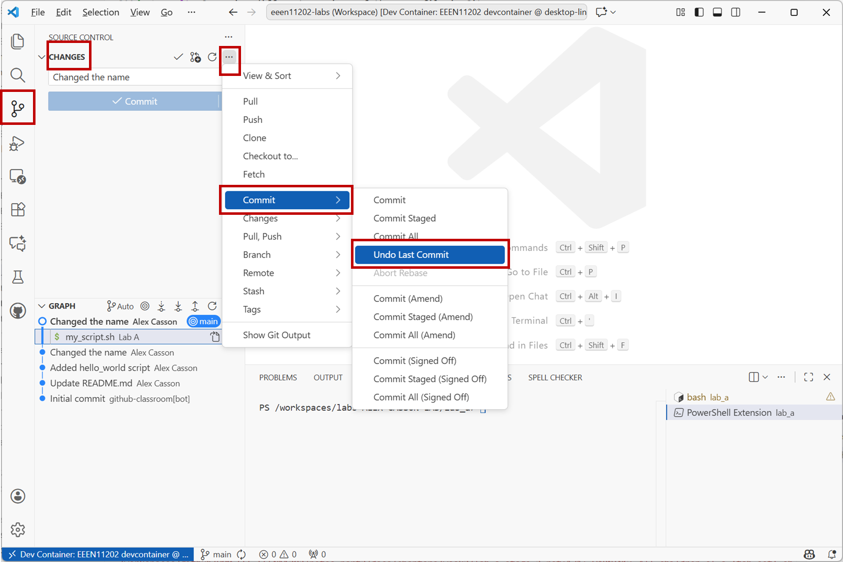 There’s lots more than you can do with the version control. We’ll cover more in future labs. For now, explore the VSCode interface a bit more. Explore different options and settings. Try making more changes to your scripts. Then move on to the assignment.