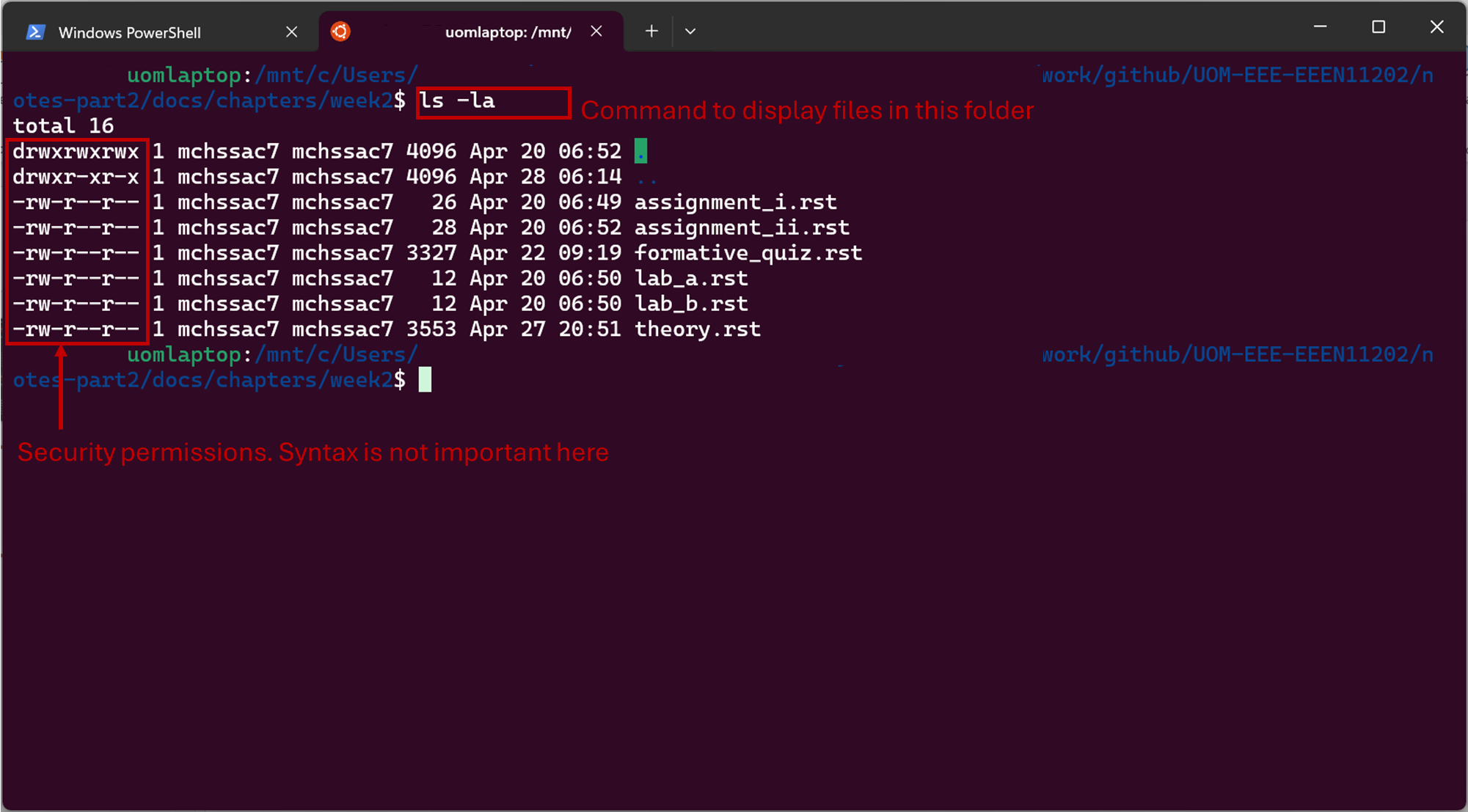 into the command line you will get a display of the permissions that are present. (Remember the > or $ is displayed by the terminal for you. You don’t need to enter it, it’s to show you each command.) This display is slightly different depending on your operating system. Examples are shown below. We won’t worry about the exact syntax of these here.