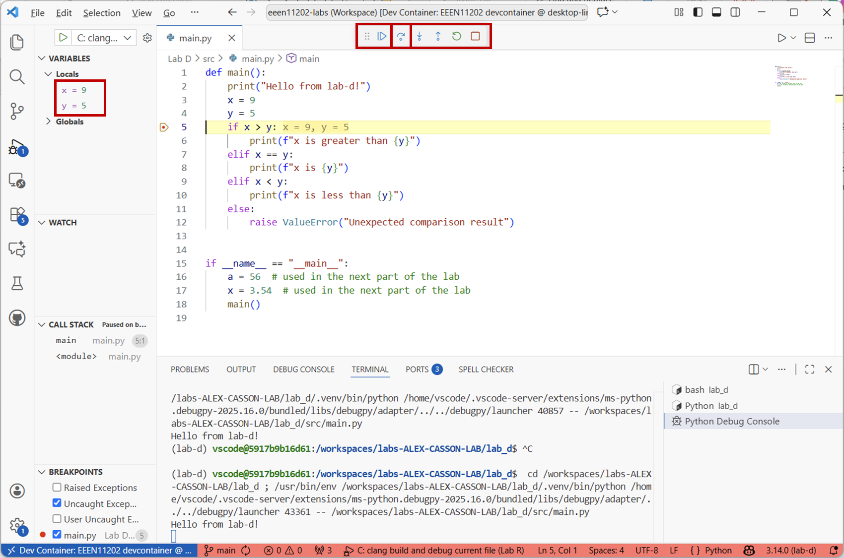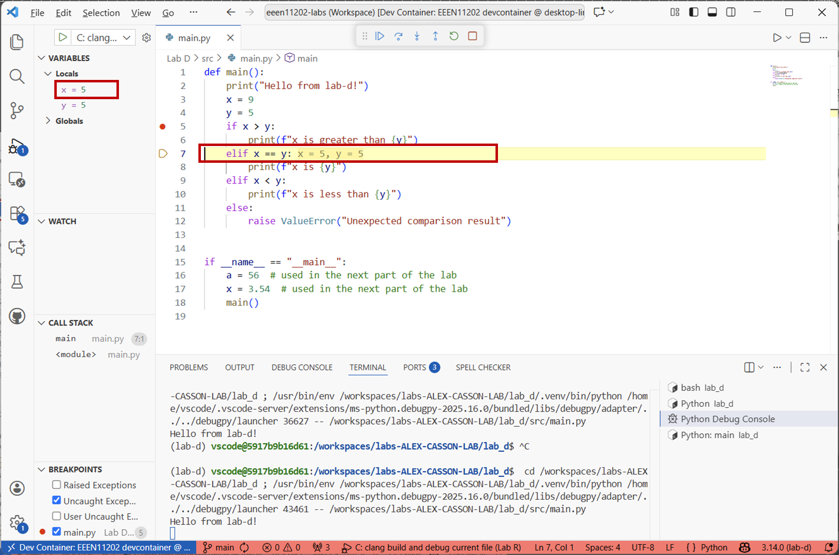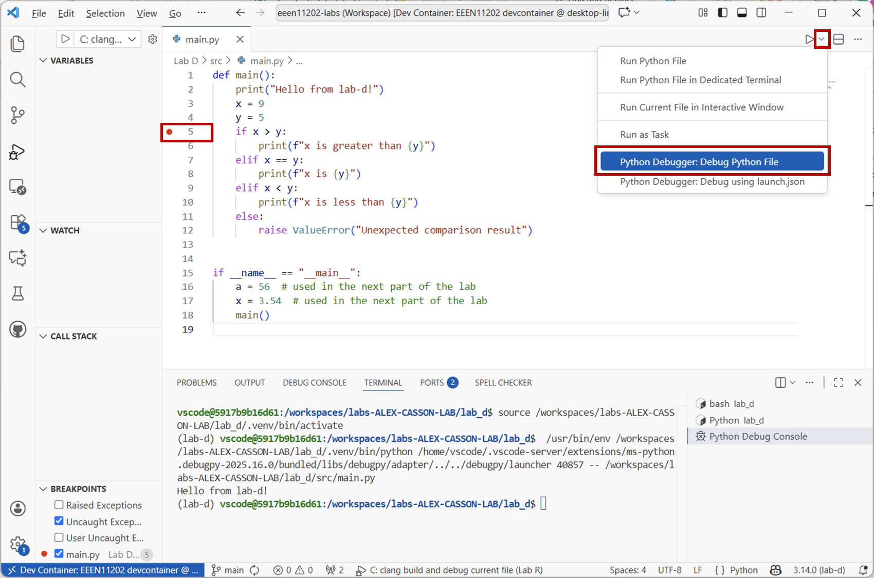 main.pyfile with the code below.def main() print(Hello from lab-d!") x == 9 y = 5 if x > y: print(f"x is greater than {y}") else if x == y print(f"x is {y}") elsif x < y: print(f"x is less than {y}") else: raise ValueError("Unexpected comparison result") if __name__ == "__main__": main()