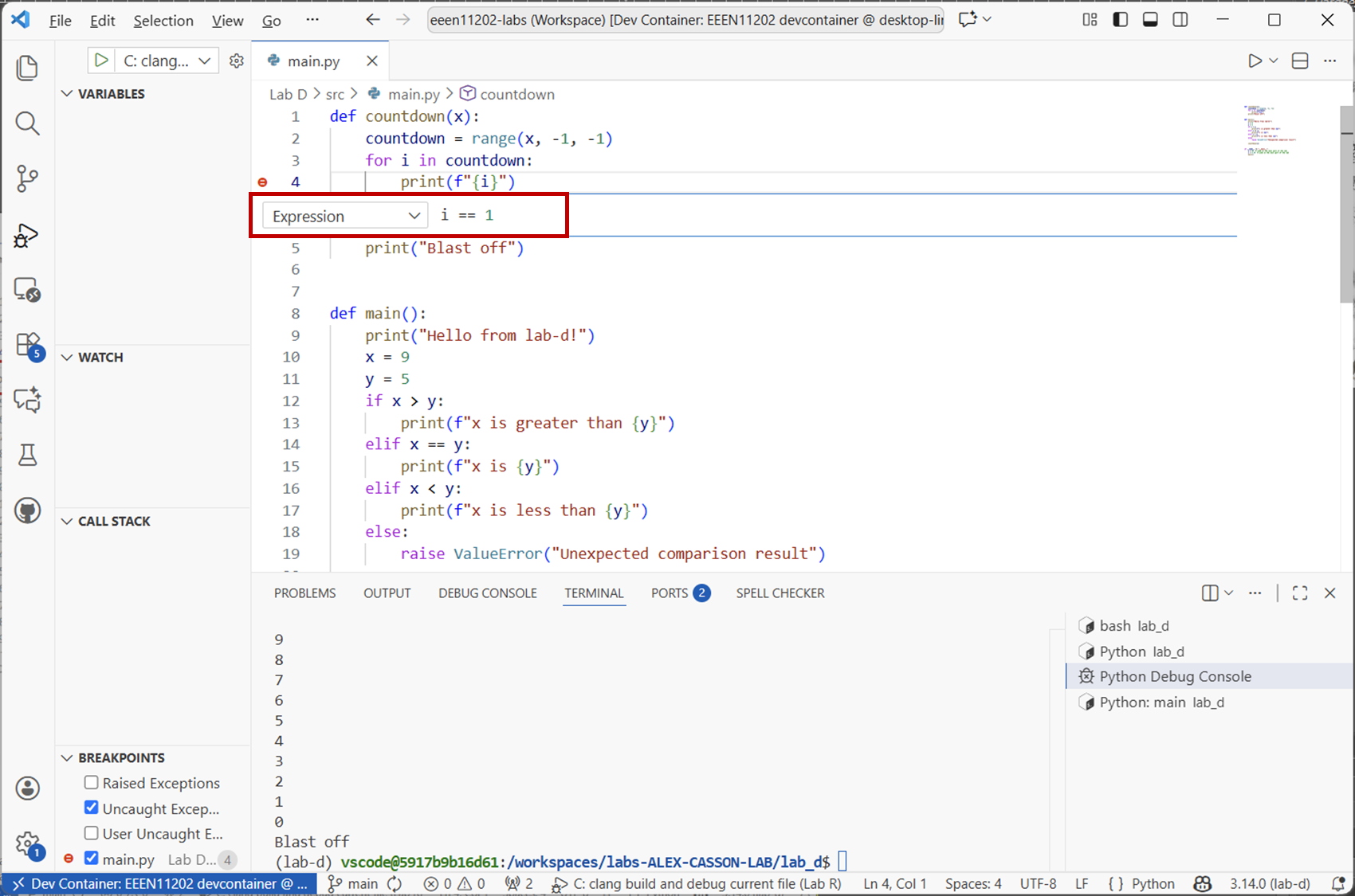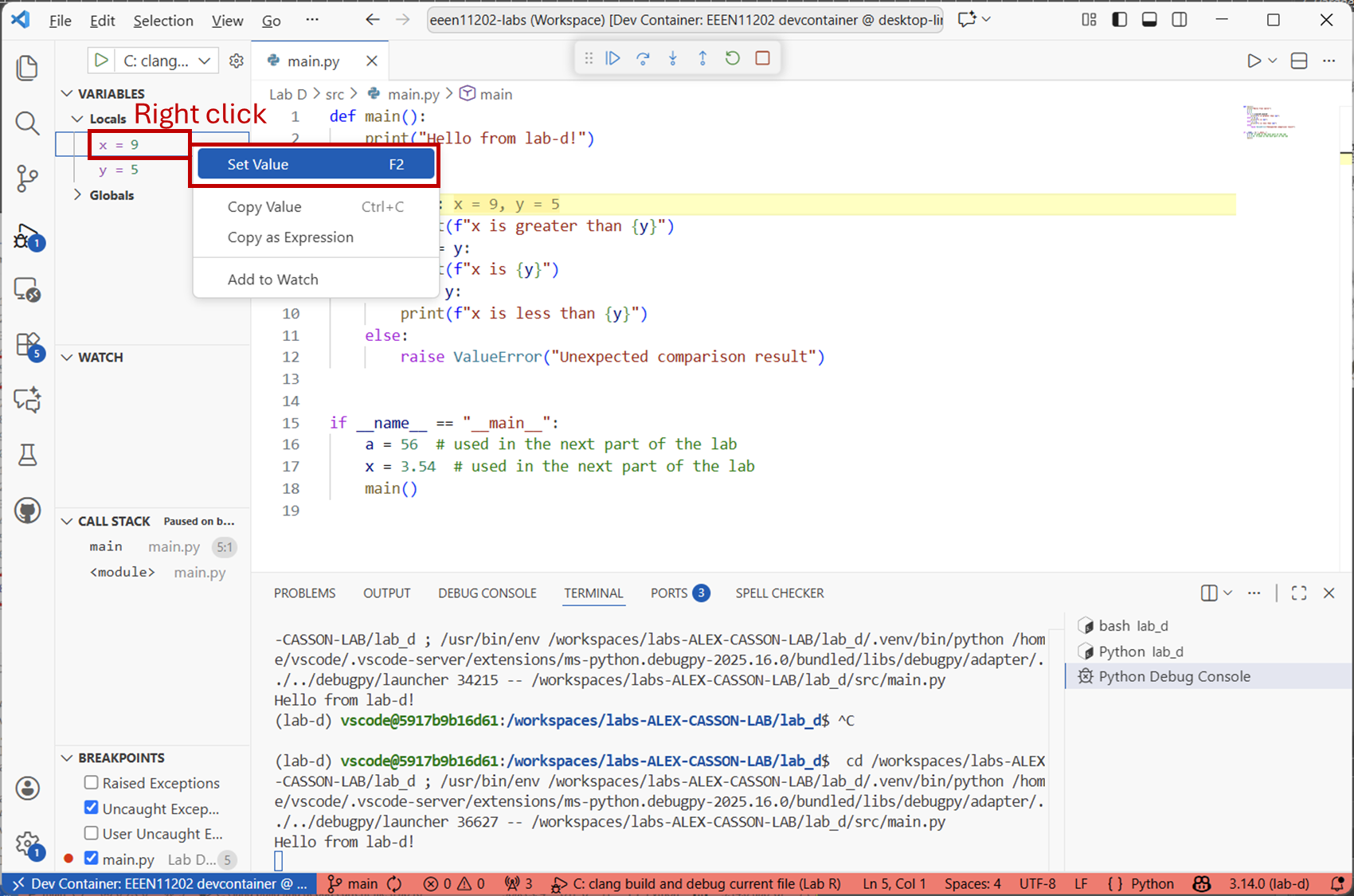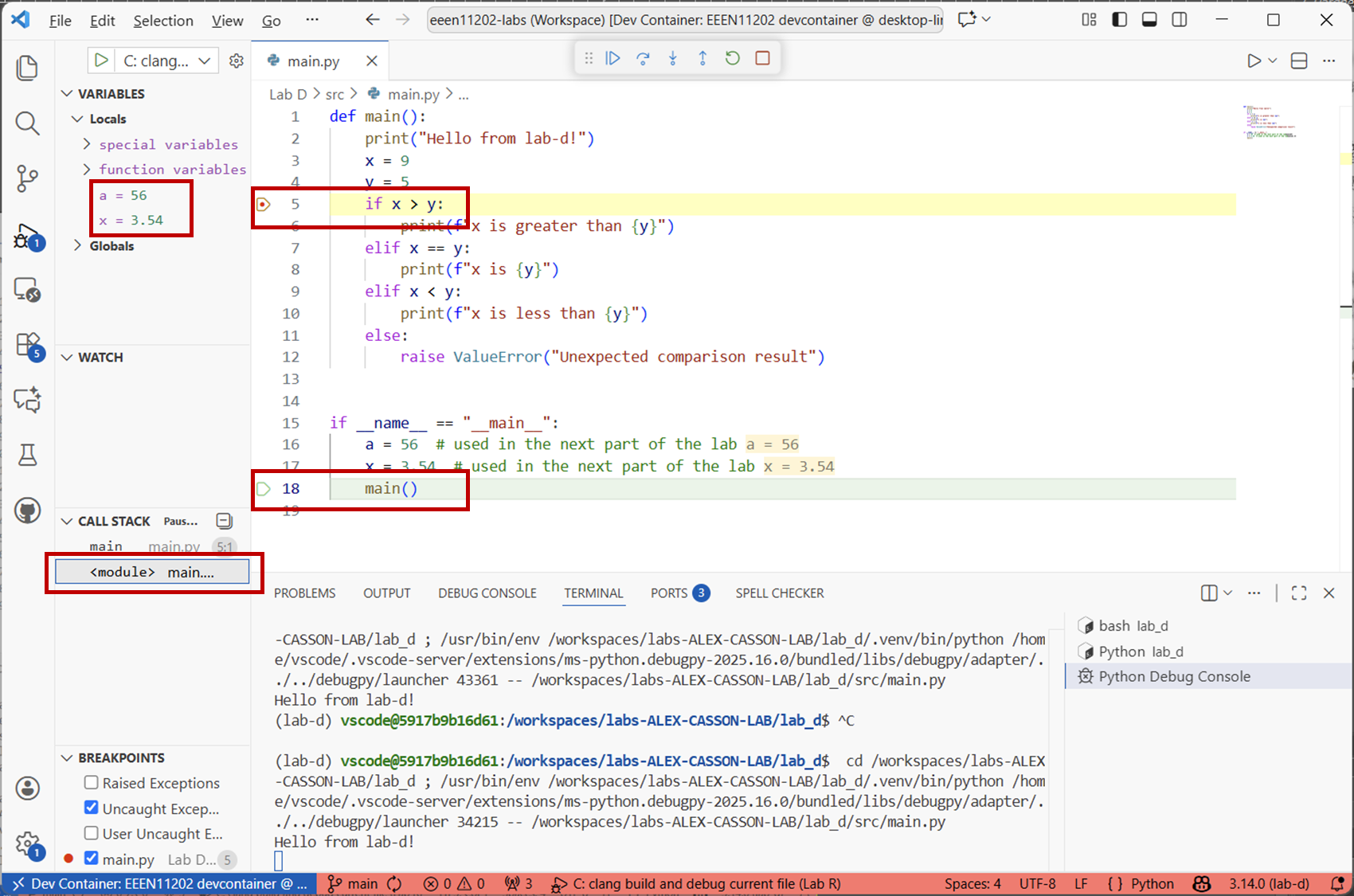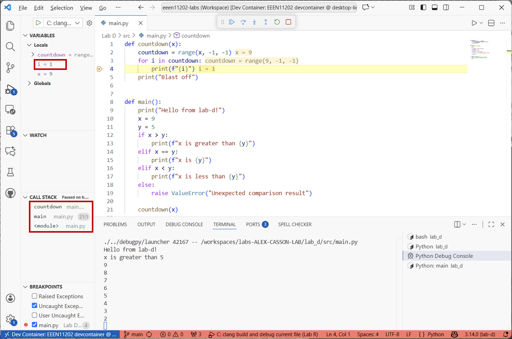 main.pyfile with the code below.def main() print(Hello from lab-d!") x == 9 y = 5 if x > y: print(f"x is greater than {y}") else if x == y print(f"x is {y}") elsif x < y: print(f"x is less than {y}") else: raise ValueError("Unexpected comparison result") if __name__ == "__main__": main()