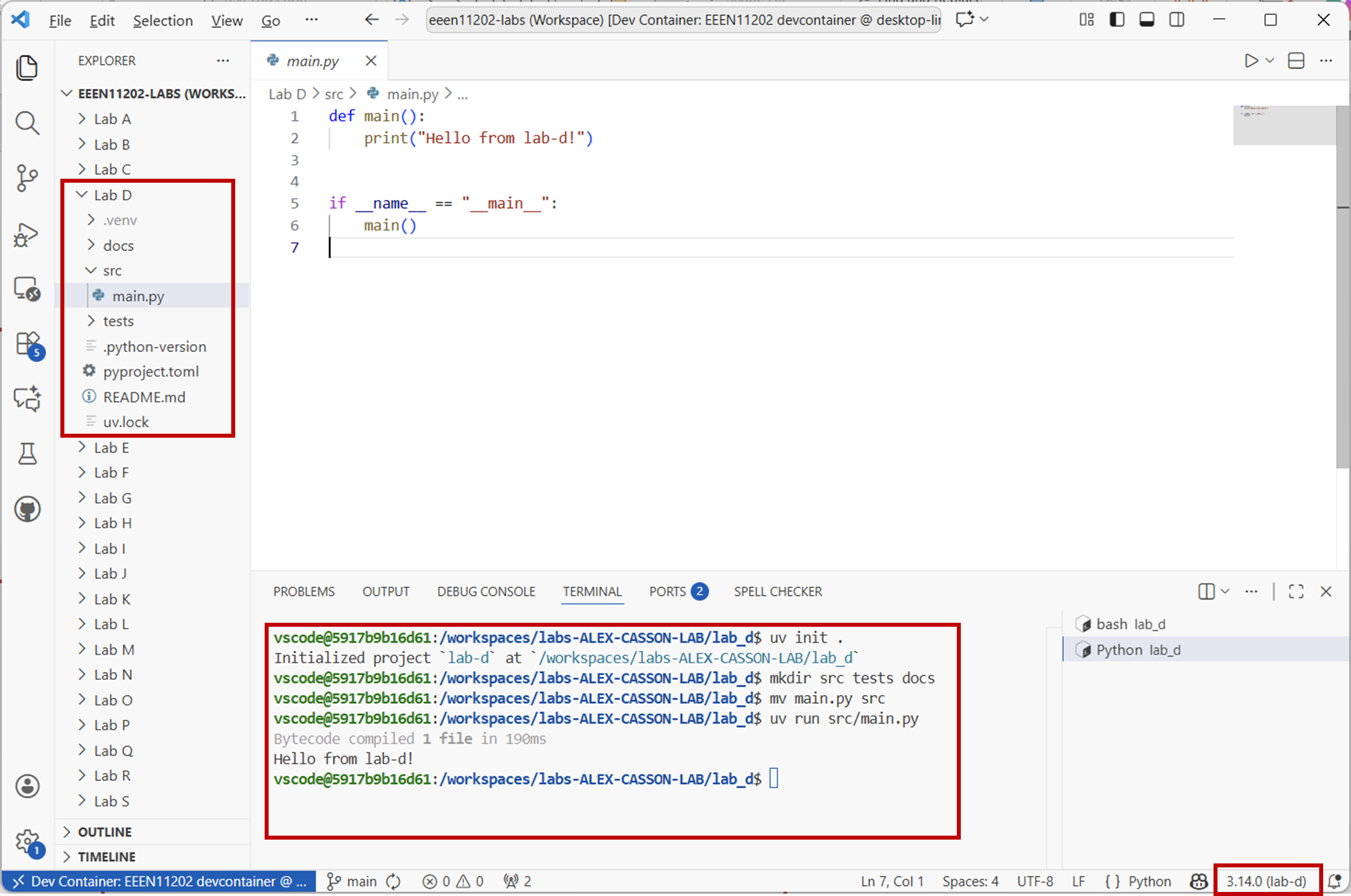 cd /workspaces/`ls /workspaces` && mkdir -p lab-d cd /workspaces/`ls /workspaces`/lab-d uv init .