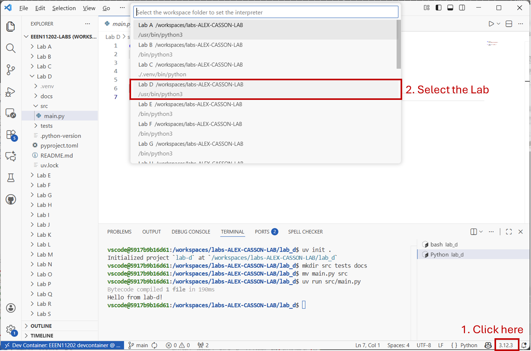 cd /workspaces/`ls /workspaces` && mkdir -p lab-dmakes the lab-d folder. There are no pre-downloaded files needed for Lab D. Sometimes this means that the Lab D folder isn’t downloaded automatically (because it’s empty).cd /workspaces/`ls /workspaces`/lab-dmakes sure we are working in the lab-d folder.uv init .is the interesting command. This actually sets up our virtual environment.