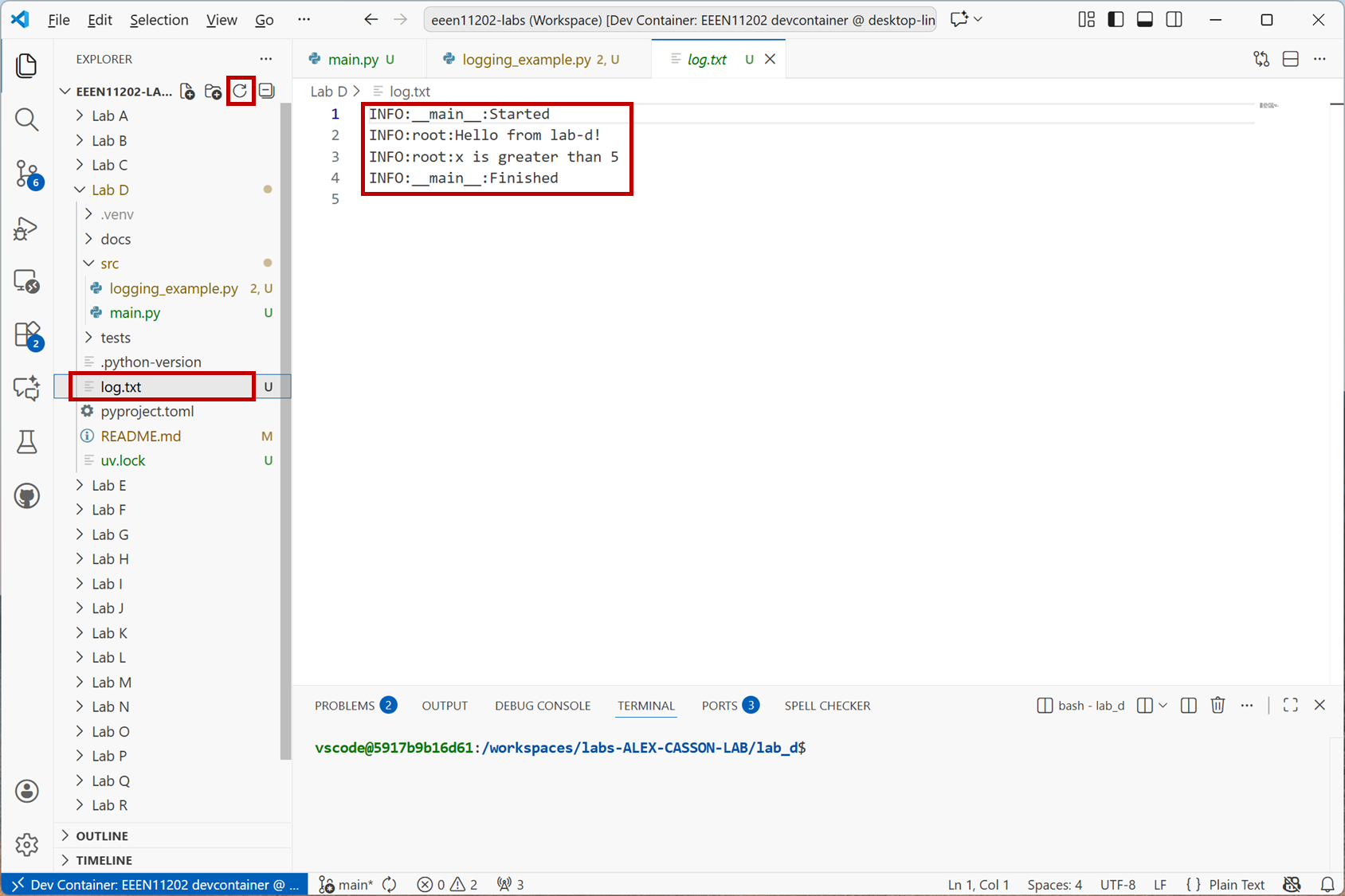log.txtin your Lab D folder. If it doesn’t show up straight away, press theRefreshbutton in the VSCode file explorer.