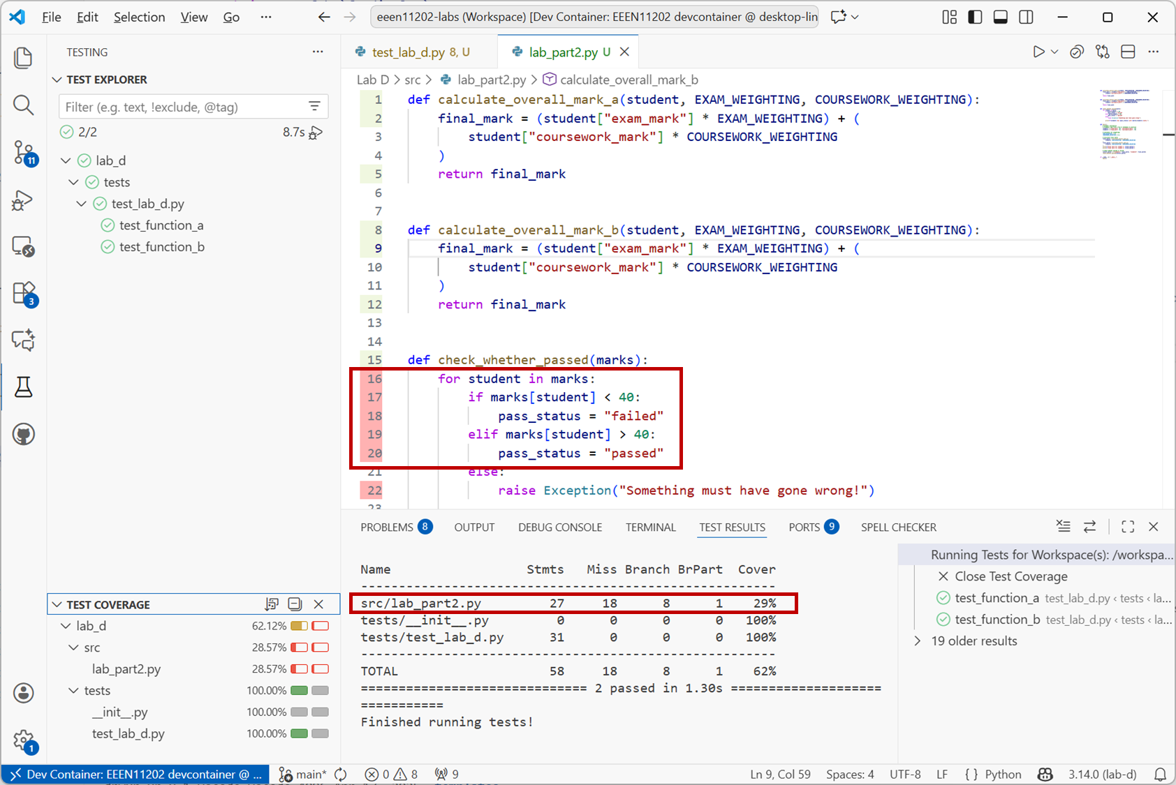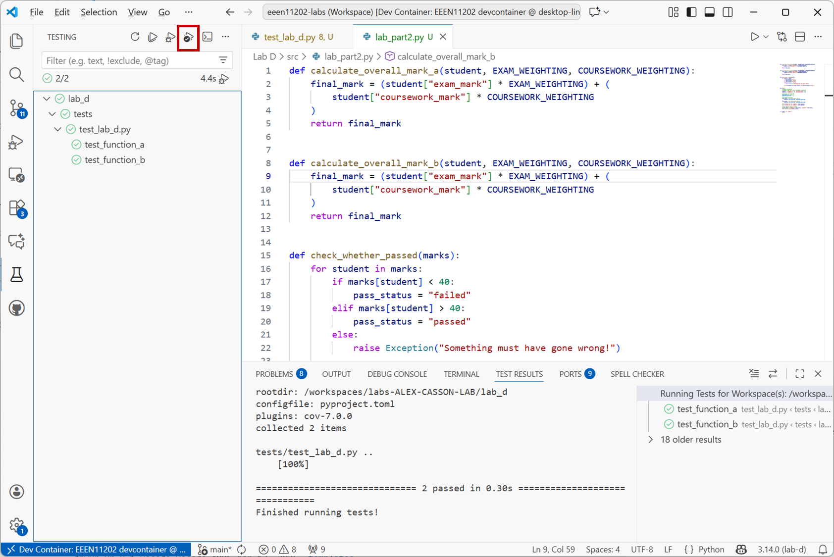 test_lab_d_code.pywith the code below to add some actual tests for our two functions.import pytest from src.lab_part2 import * # Constants for weightings EXAM_WEIGHTING = 0.8 COURSEWORK_WEIGHTING = 0.2 def test_function_a(): student1 = {"exam_mark": 65, "coursework_mark": 34} correct_mark1 = 58.8 mark1 = calculate_overall_mark_a(student1, EXAM_WEIGHTING, COURSEWORK_WEIGHTING) assert mark1 == correct_mark1 student2 = {"exam_mark": 15, "coursework_mark": 70} correct_mark2 = 26.0 mark2 = calculate_overall_mark_a(student2, EXAM_WEIGHTING, COURSEWORK_WEIGHTING) assert mark2 == correct_mark2 student3 = {"exam_mark": 80, "coursework_mark": 90} correct_mark3 = 82.0 mark3 = calculate_overall_mark_a(student3, EXAM_WEIGHTING, COURSEWORK_WEIGHTING) assert mark3 == correct_mark3 def test_function_b(): student1 = {"exam_mark": 65, "coursework_mark": 34} correct_mark1 = 58.8 mark1 = calculate_overall_mark_b(student1, EXAM_WEIGHTING, COURSEWORK_WEIGHTING) assert mark1 == correct_mark1 student2 = {"exam_mark": 15, "coursework_mark": 70} correct_mark2 = 26.0 mark2 = calculate_overall_mark_b(student2, EXAM_WEIGHTING, COURSEWORK_WEIGHTING) assert mark2 == correct_mark2 student3 = {"exam_mark": 80, "coursework_mark": 90} correct_mark3 = 82.0 mark3 = calculate_overall_mark_b(student3, EXAM_WEIGHTING, COURSEWORK_WEIGHTING) assert mark3 == correct_mark3