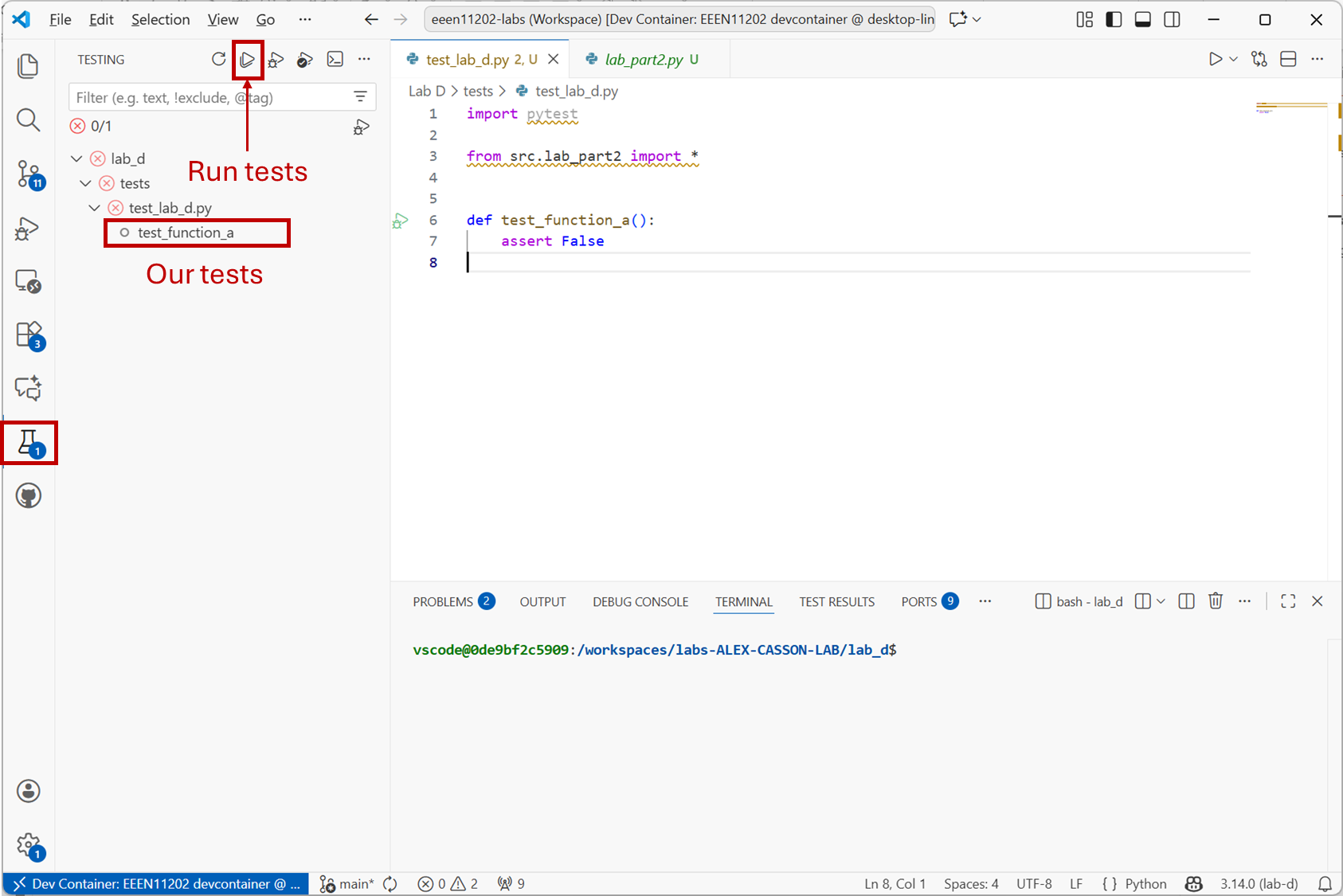 import pytestsets up Pytest.from src.lab_part2 import *tells this file where our code to test is. It’s in thesrcfolder, in a file calledlab_part2.py. (Python uses a dot.in the address rather than the slash/the terminal uses.)*tells Python to import everything from that file. We can use only parts of the file if we’d like.def test_function_a():is the code for our test. Here we have only test, and indeed one test that will alway fail. We’ll make it actually do something useful soon. Pytest will automatically find any function that starts withtest_and run it as a test.