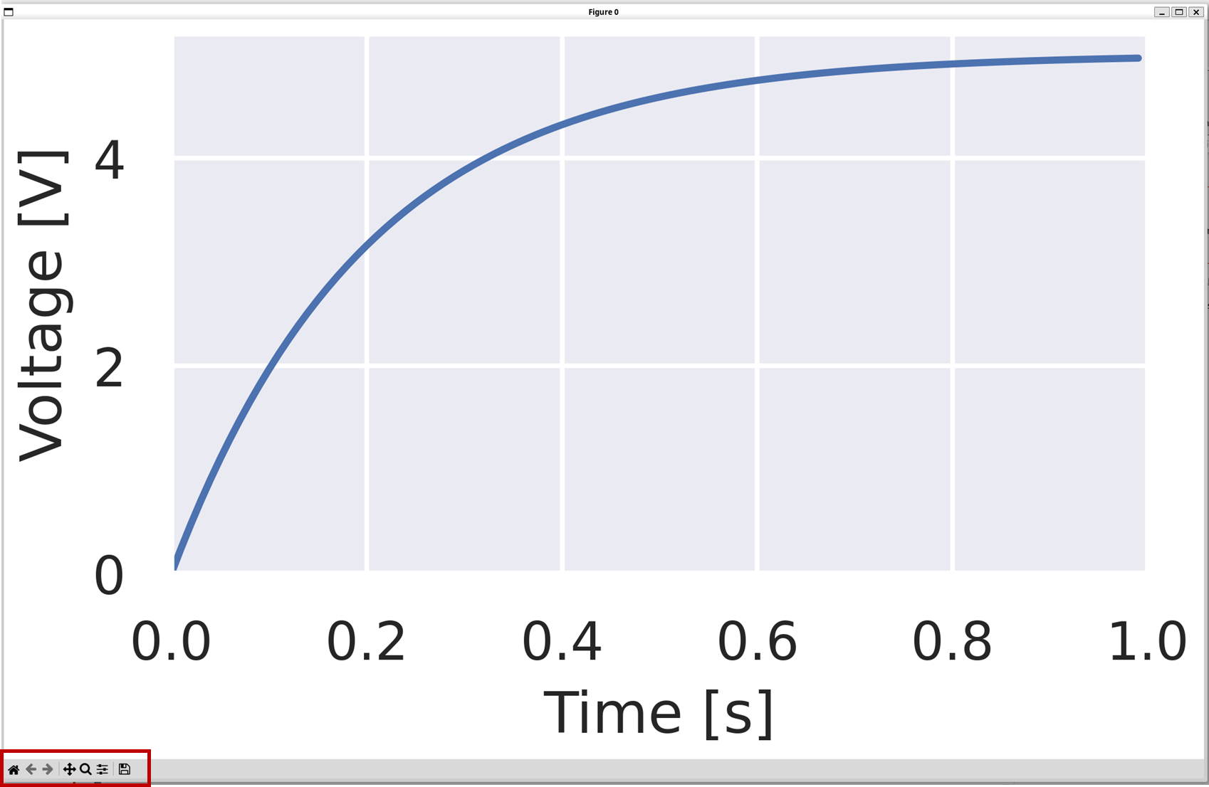 if __name__ == "__main__": # Make first line t, v = make_example_signal(A=5, tau=0.2) # Plot first line fig0, ax0 = plt.subplots() # make a new figure, no. 0 ax0.plot(t, v) ax0.set(xlabel="Time [s]") ax0.set(ylabel="Voltage [V]") ax0.set(xlim=(0, 1)) # set the default zoom ax0.set(ylim=(0, 5.2)) fig0.show() # Put this at the end of the code - further examples below should be above this plt.show()