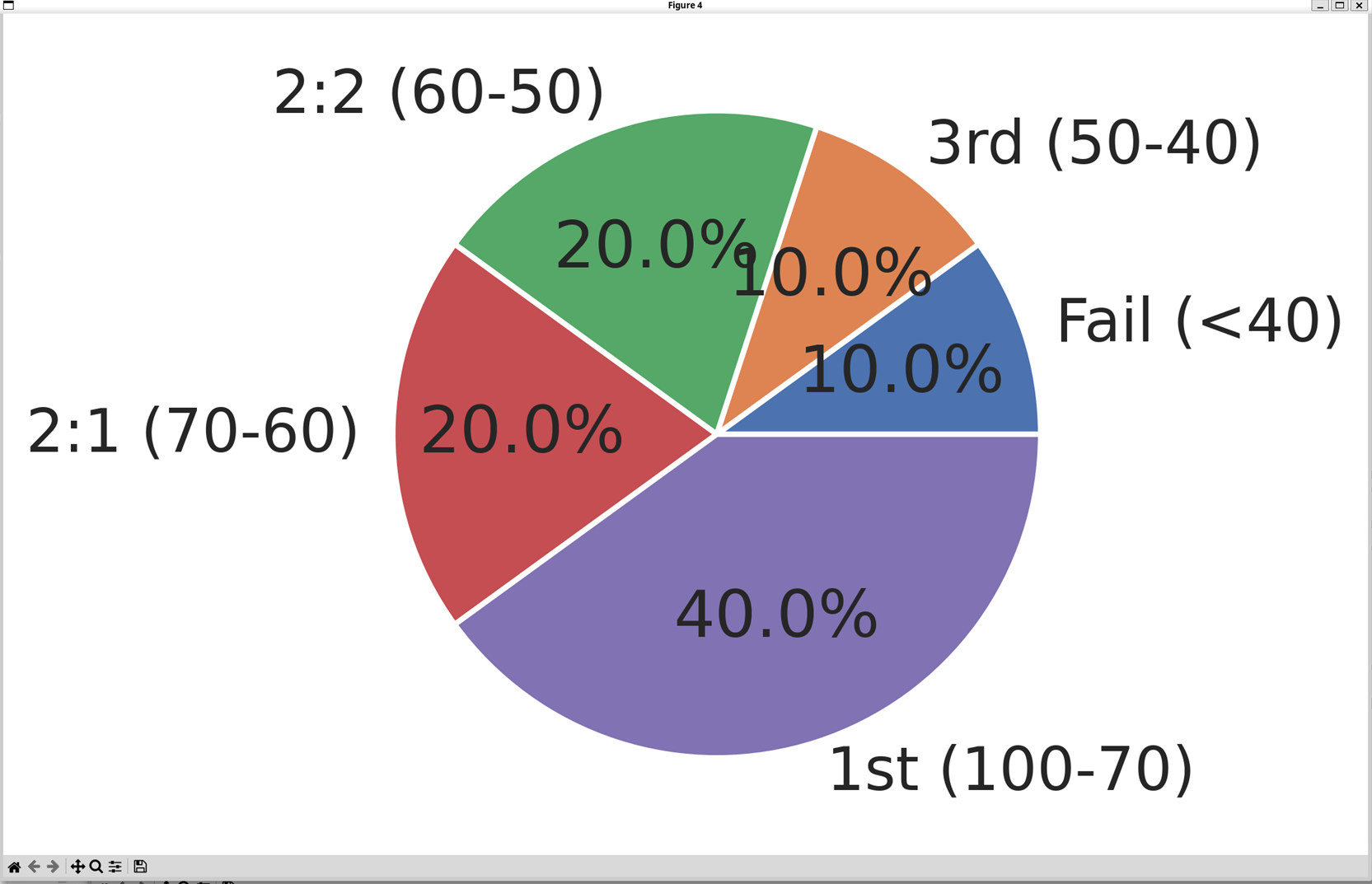 # Make a pie chart for grade distribution in course 1 boundaries = (100, 70, 60, 50, 40, 0) fig3 = px.pie( names=[ f"1st ({boundaries[1]}-{boundaries[0]})", f"2:1 ({boundaries[2]}-{boundaries[1]})", f"2:2 ({boundaries[3]}-{boundaries[2]})", f"3rd ({boundaries[4]}-{boundaries[3]})", f"Fail (<{boundaries[4]})", ], values=[ np.sum(marks_course_1 >= boundaries[1]), np.sum( (marks_course_1 >= boundaries[2]) & (marks_course_1 < boundaries[1]) ), np.sum( (marks_course_1 >= boundaries[3]) & (marks_course_1 < boundaries[2]) ), np.sum( (marks_course_1 >= boundaries[4]) & (marks_course_1 < boundaries[3]) ), np.sum(marks_course_1 < boundaries[4]), ], ) fig3.show()