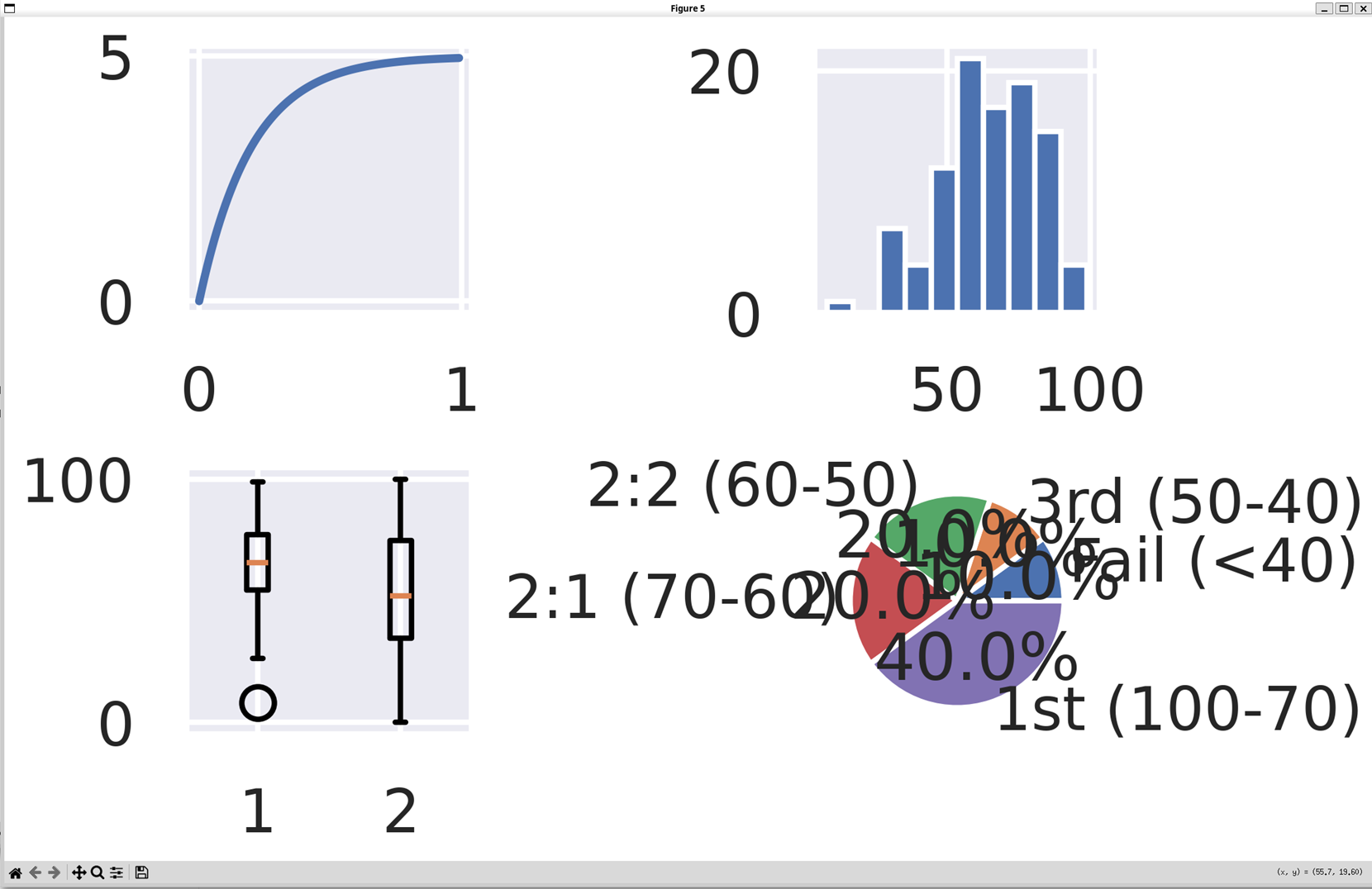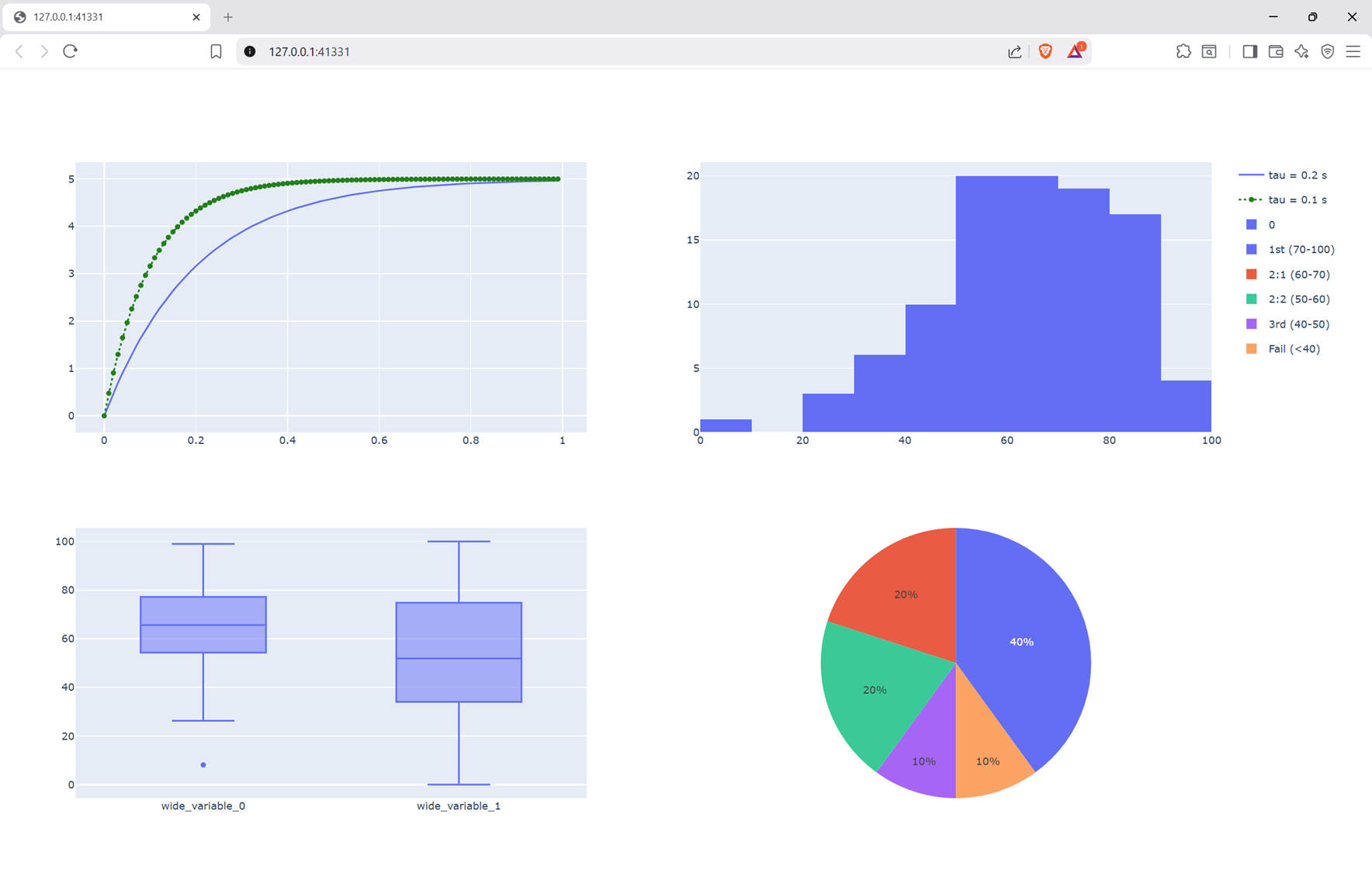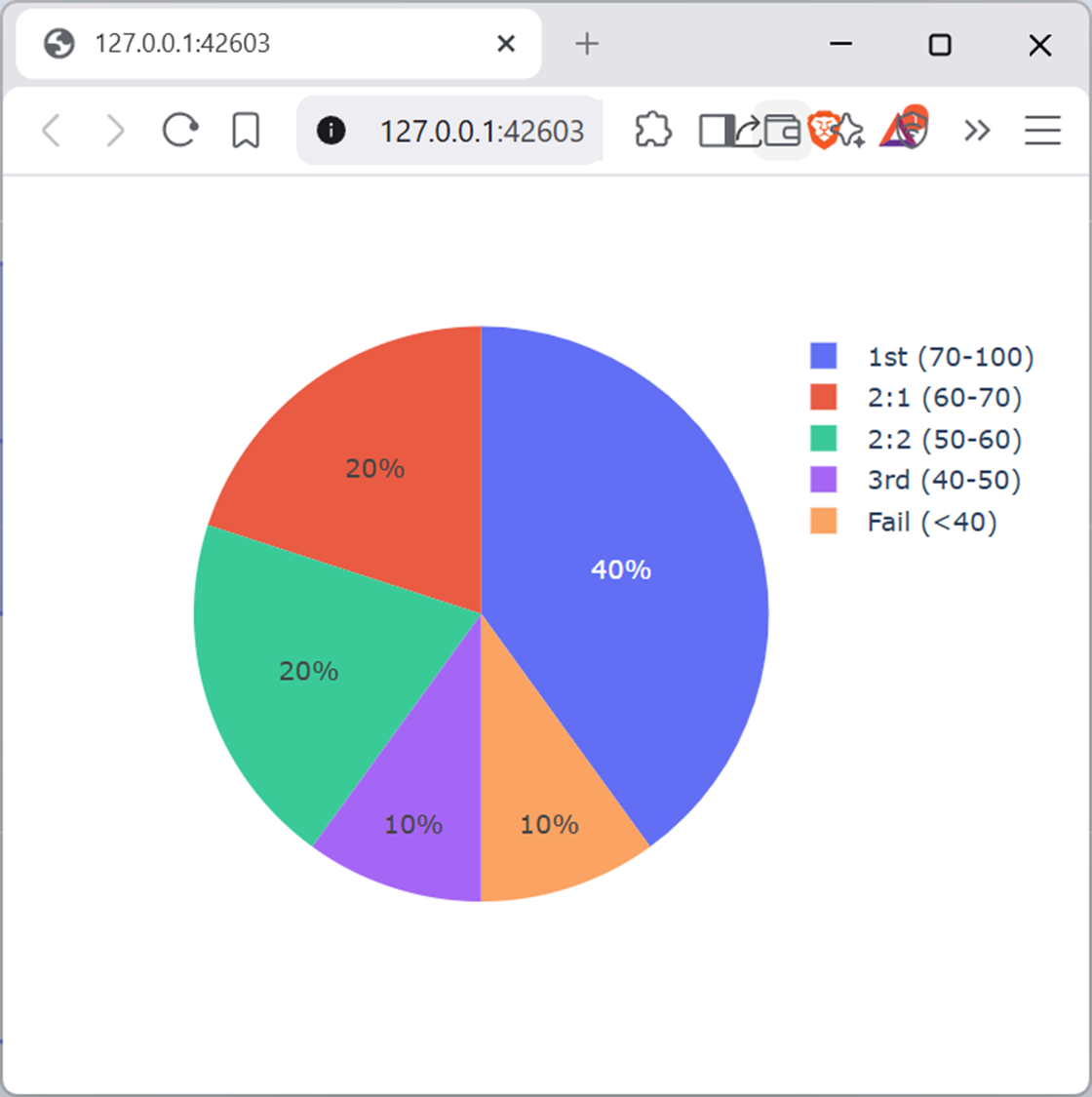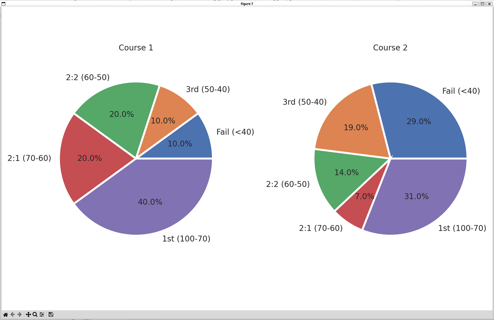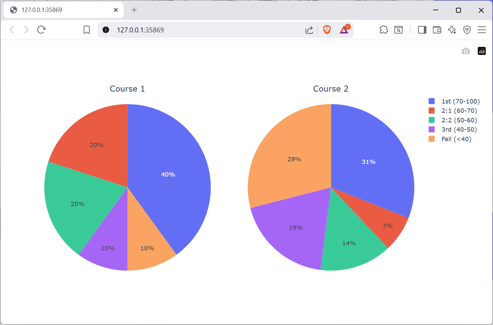 .add_trace()to add data to each subplot directly. So far we’ve been using Plotly Expresspxto quickly build graphs. Unfortunately these aren’t compatible with.add_trace(). Instead we need to use Plotly Graph Objectsgoto give more control. We’re not going to cover them in a lot of detail here, but add the code below to your file as an example creating two Pie charts next to each other.fig5 = make_subplots( rows=1, cols=2, subplot_titles=("Course 1", "Course 2"), specs=[[{"type": "domain"}, {"type": "domain"}]], ) fig5.add_trace( go.Pie( labels=[ f"1st ({boundaries[1]}-{boundaries[0]})", f"2:1 ({boundaries[2]}-{boundaries[1]})", f"2:2 ({boundaries[3]}-{boundaries[2]})", f"3rd ({boundaries[4]}-{boundaries[3]})", f"Fail (<{boundaries[4]})", ], values=[ np.sum(marks_course_1 >= boundaries[1]), np.sum( (marks_course_1 >= boundaries[2]) & (marks_course_1 < boundaries[1]) ), np.sum( (marks_course_1 >= boundaries[3]) & (marks_course_1 < boundaries[2]) ), np.sum( (marks_course_1 >= boundaries[4]) & (marks_course_1 < boundaries[3]) ), np.sum(marks_course_1 < boundaries[4]), ], ), row=1, col=1, ) fig5.add_trace( go.Pie( labels=[ f"1st ({boundaries[1]}-{boundaries[0]})", f"2:1 ({boundaries[2]}-{boundaries[1]})", f"2:2 ({boundaries[3]}-{boundaries[2]})", f"3rd ({boundaries[4]}-{boundaries[3]})", f"Fail (<{boundaries[4]})", ], values=[ np.sum(marks_course_2 >= boundaries[1]), np.sum( (marks_course_2 >= boundaries[2]) & (marks_course_2 < boundaries[1]) ), np.sum( (marks_course_2 >= boundaries[3]) & (marks_course_2 < boundaries[2]) ), np.sum( (marks_course_2 >= boundaries[4]) & (marks_course_2 < boundaries[3]) ), np.sum(marks_course_2 < boundaries[4]), ], ), row=1, col=2, ) fig5.show()