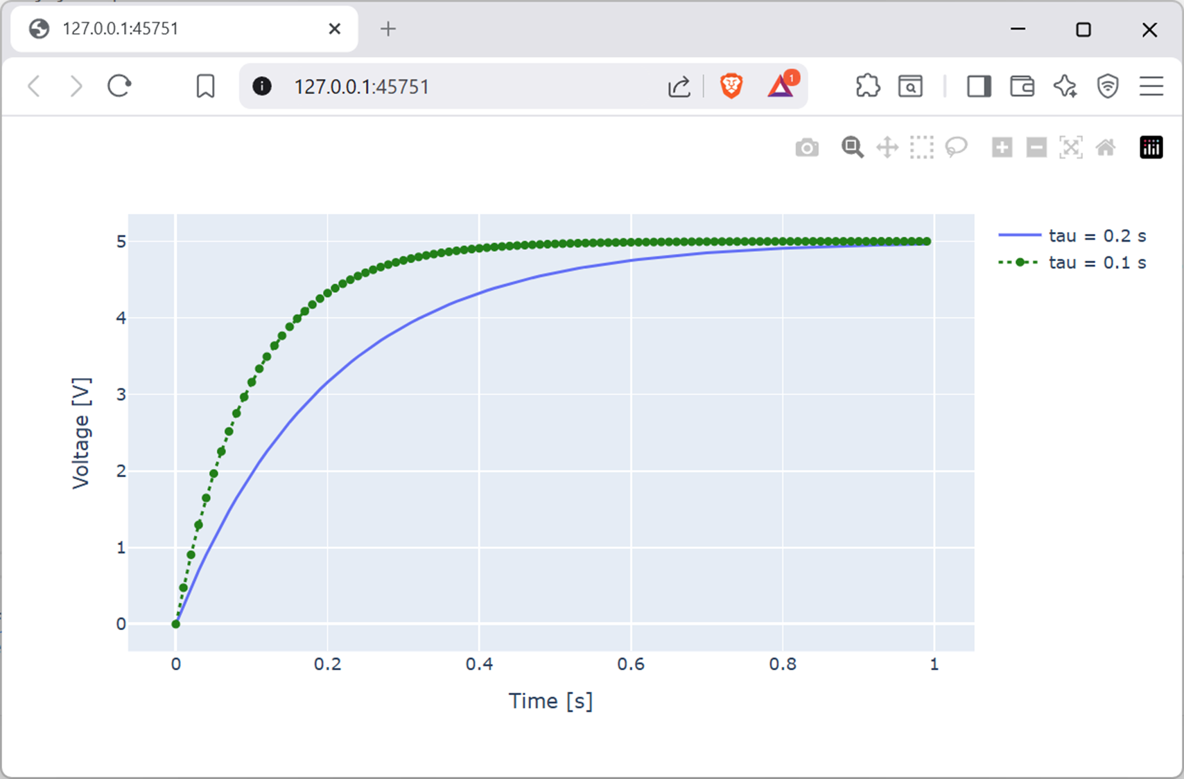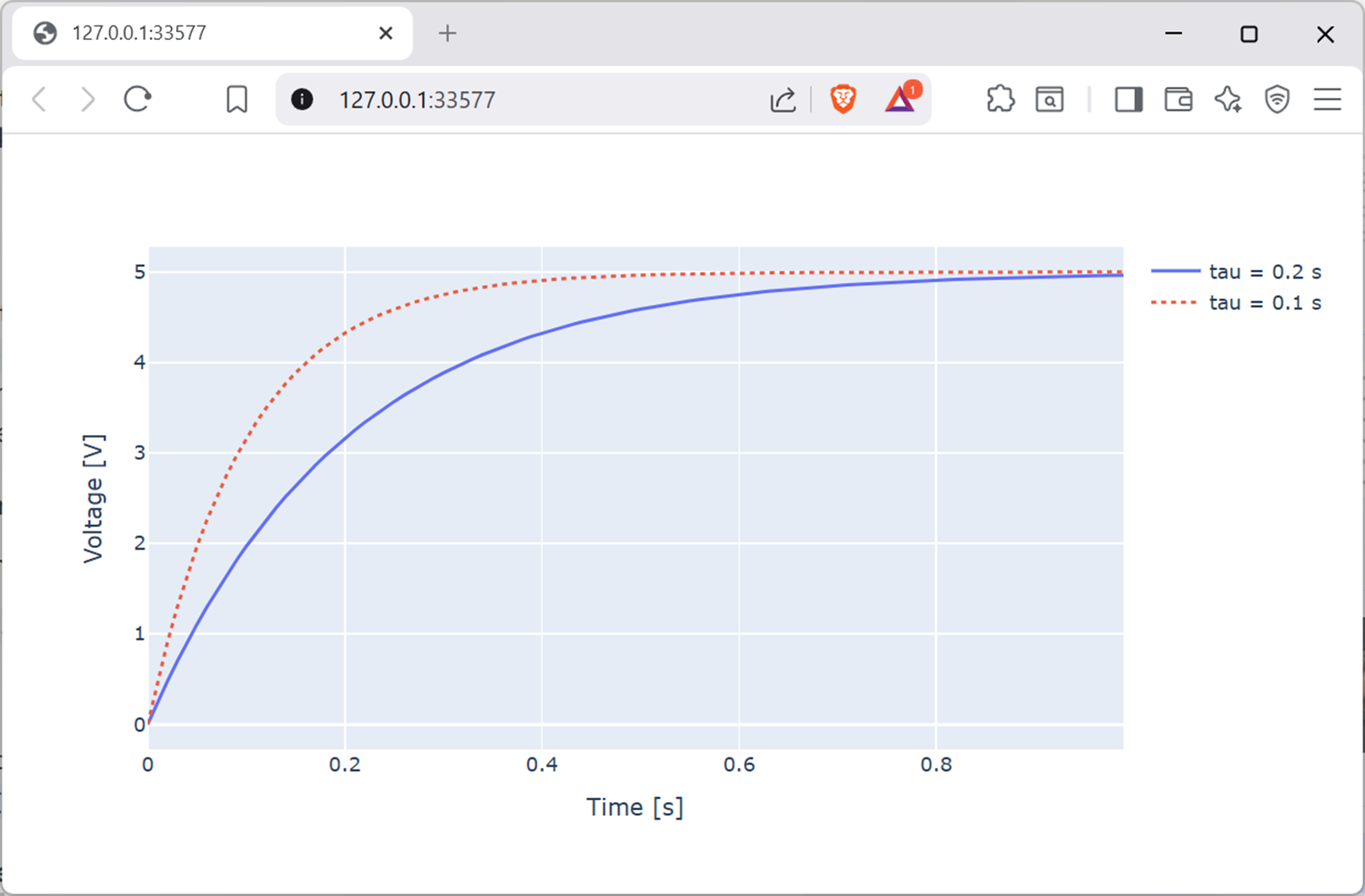 if __name__ == "__main__": t, v = make_example_signal(A=5, tau=0.2) fig0 = px.line(x=t, y=v, labels={"x": "Time [s]", "y": "Voltage [V]"}) fig0.show()
