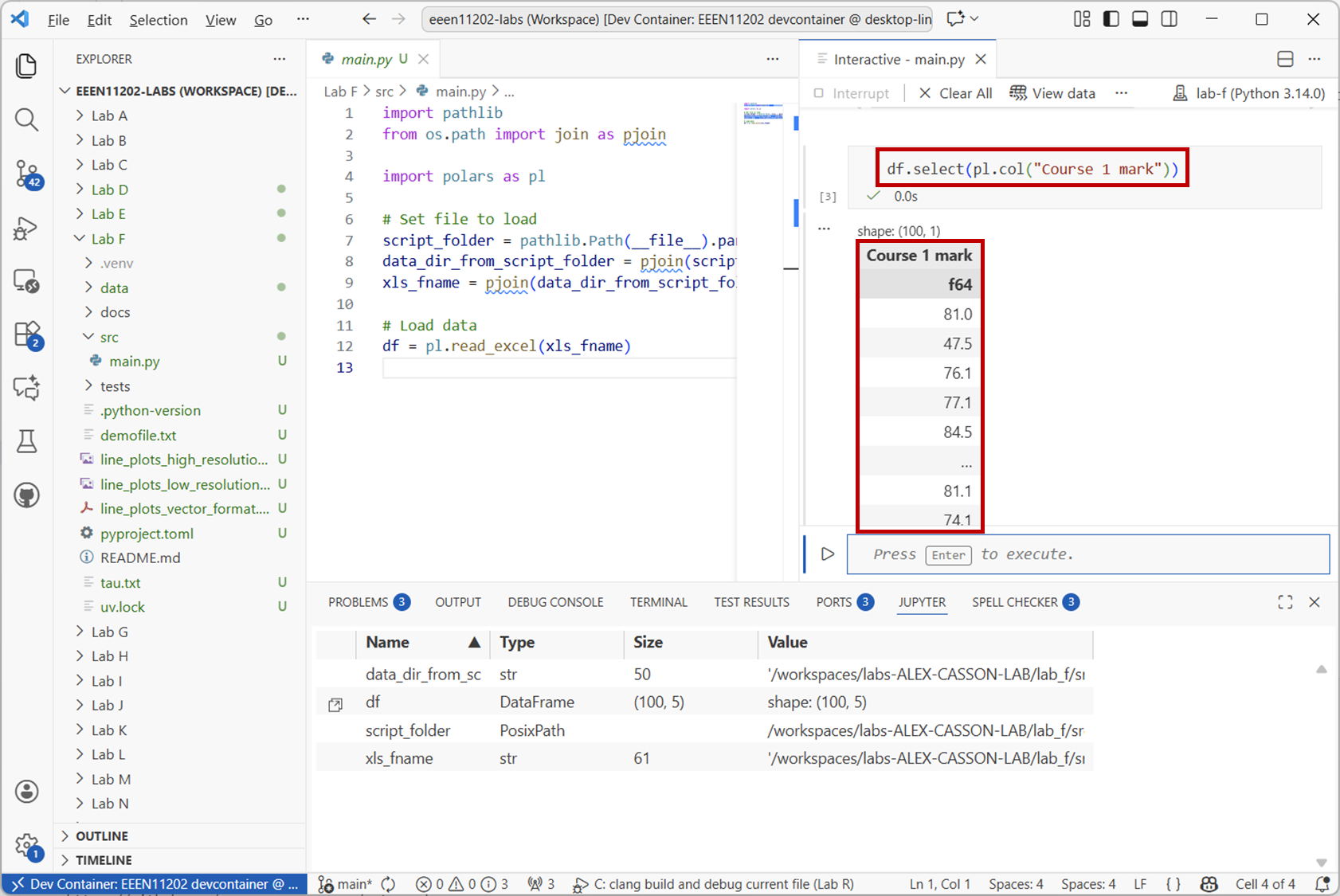 .select()method. For example, to get theCourse 1 markcolumn:df.select(pl.col("Course 1 mark"))