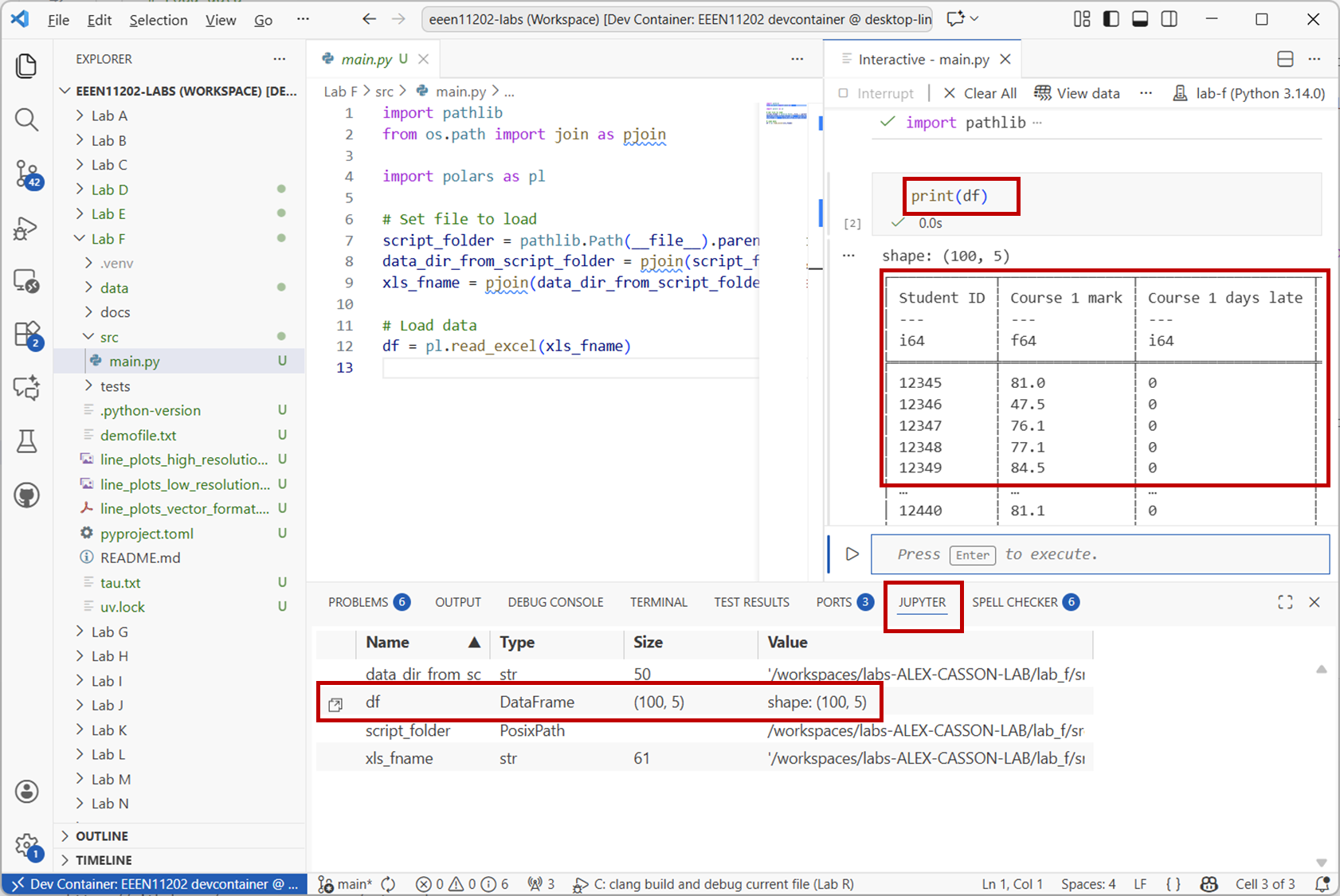Also, we’ll run this file interactively. That is, we wont’ use an if __name__ == "__main__": block, but instead put everything in the global scope. We covered this in Lab B. This style is quite common with data science type programmers. We’re going to use it here as it means we can use the Jupyter variable explorer to see the contents of the dataframe, which is useful when just starting out as the debugger doesn’t have as good a way of visualizing dataframes yet.
