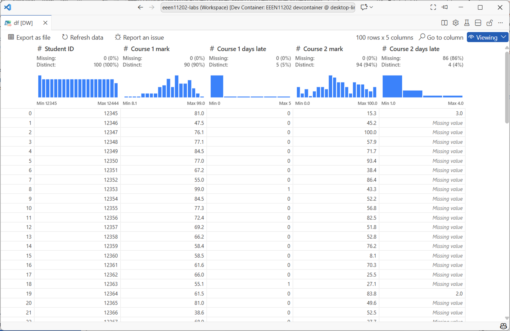 Course 2 late dayscolumn with0:Changing one value in the dataframe has a slightly complicated syntax. To set the mark of student 12345 for Course 1 to 100: