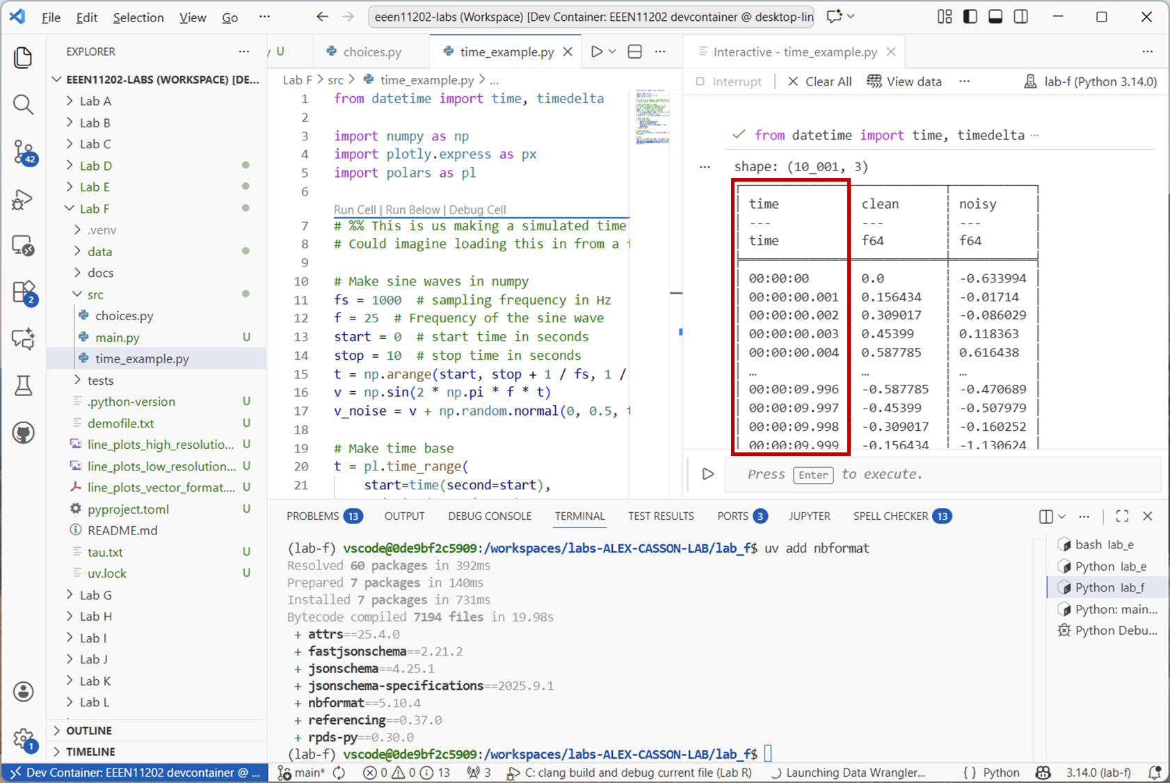 Polars can load data from lots of different sources, not only Excel spreadsheets. In this last example though we’ll look at making a time series and putting this into a dataframe. We’ll use sine waves as a simple starting point, but these could be representing stock prices, energy usage in a building, or any data source that varies over time.