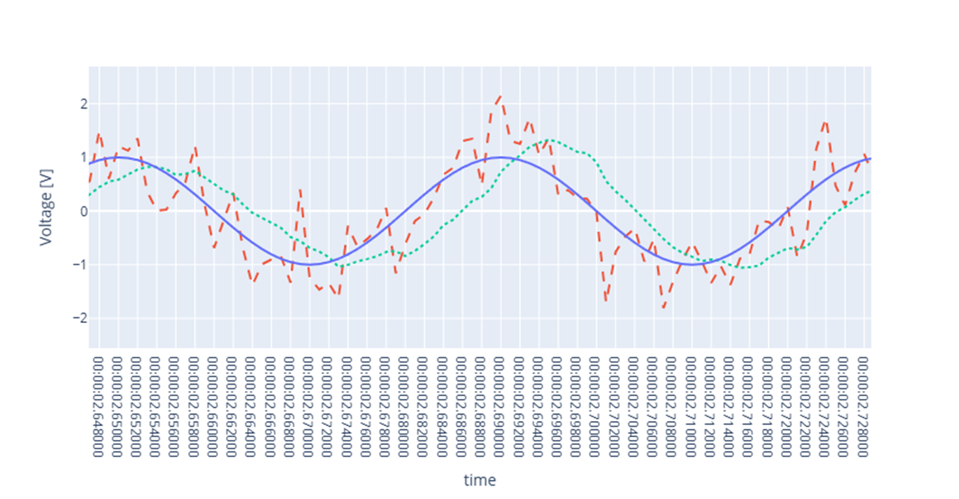 df = df.with_columns(pl.col("noisy").rolling_mean(window_size=11).alias("filtered")) # Plot fig.add_scatter(x=df["time"], y=df["filtered"], mode="lines", line=dict(dash="dot")) fig.data[2].showlegend = False fig.show()